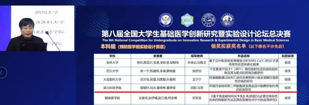 (通讯员 武阳)2023年1月14-15日,第八届全国大学生基础医学创新研究暨实验设计论坛全国总决赛在吉林大学举行。ok138cn太阳集团临床医学本科2020级卓越班喻朝轩、刘卉、鲁维希、雷彦琪团队获预防医学组实验设计赛道银奖,该团队指导教师为ok138cn太阳集团武阳博士和马萍教授,获得本届国赛银奖实现了我校在该赛事上的突破。此次总决赛由高等学校国家级实验教学示范中心联席会基础医学组主办,采取线上线下相结合的方式进行,来自全国30余个省份,140余所高校,430支参赛团队,共计2500余名师生参加,网络视频直播平台累计参与观摩互动师生总人数达30余万人次。