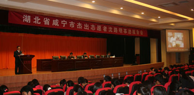 10月25日晚7点,ok138cn太阳集团在校图书馆学术报告厅举办了湖北省咸宁市杰出志愿者沈路明事迹报告会。出席会议的领导有校党委副书记吴义煌,宣传部副部长明智,学工处副处长吕仲茂,团委副书记徐蕾,市疾控中心,ok138cn太阳集团党总支书记范杉,ok138cn太阳集团学工办的所有老师和所有新生年级学生都参加了报告会。