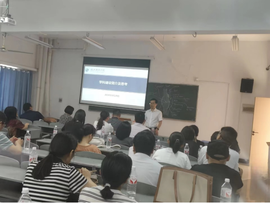 蔡飞主要就学科建设内涵、学科建设发展现状、学科建设目标和举措三个方面作了扼要介绍。他首先解读了学科建设在高校中的六大核心职能:队伍建设、人才培养、科学研究、社会服务、文化传承和国际交流。接着,他详细回顾了学科建设的发展现状,包括学科门类的发展、“十二五”湖北省重点学科的建设、国家级与省级科研平台的搭建,以及省级产业平台的推进,为学院的未来发展指明了努力方向。同时,蔡飞明确了今后学院学科建设的目标:打造基础一流学科、培育优秀人才、产出卓越成果;并从加强师资队伍建设、促进学科交叉融合、提升科研创新能力、深化教学改革、加强国际合作与交流以及推动产学研一体化等方面提出具体举措。