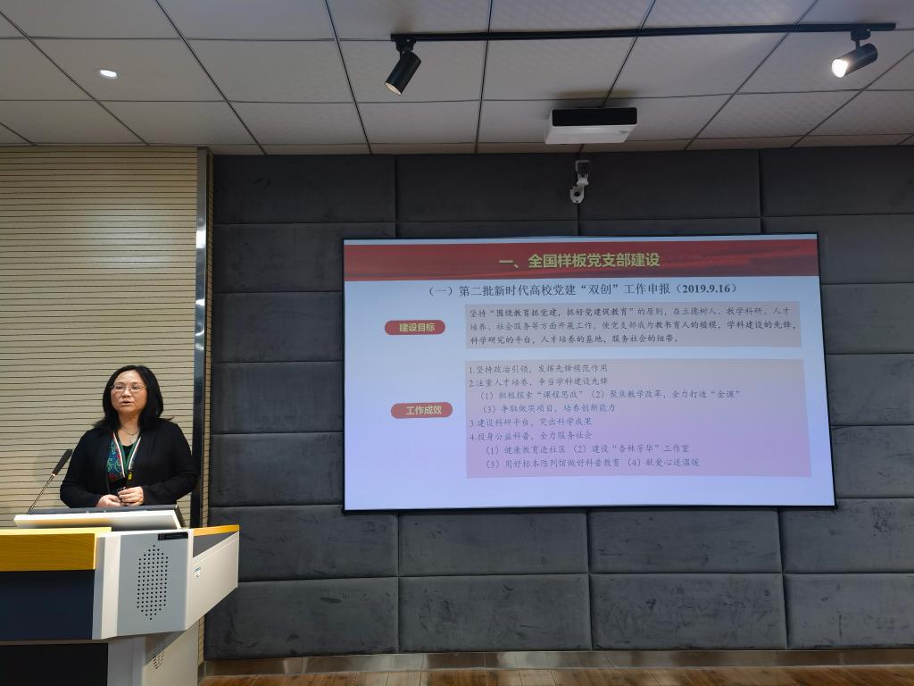 马萍教授以《全国样板党支部建设体会与国家级一流课程建设思考》为专题,深入浅出地介绍了“教育部全国党建工作样板支部建设的体会”和“国家级一流课程建设的思考”两个方面内容,以2019年第二批新时代高校党建“双创”工作申报为案例,从建设目标、工作成效、建设方案、创新点等四个方面扼要介绍了样板支部建设情况,并结合2022年验收工作,谈到了要落实的“教育党员有高度等七个有力”的重点任务以及包括体制机制、组织建设、创新机制、建设措施在内的重要措施,为后续其他党支部申报全国样板支部提供了借鉴。同时,马教授也以教学成果“基础医学课程信息化资源的建设与实践”为案例,从高等学校课程建设二十余年沿革、金课的“两性一度”标准、基于“雨课堂”的混合式教学改革、课程思政等方面,分享了个人对国家级一流课程建设的一些思考。